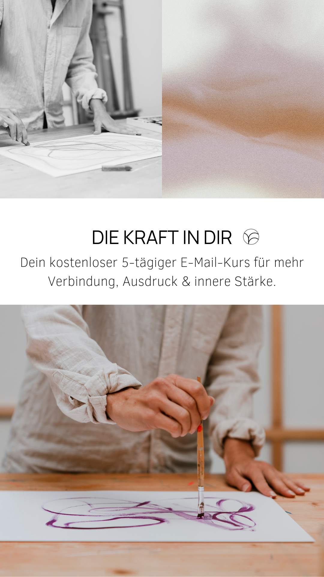 In diesem 5-tägigen E-Mail-Kurs gebe ich dir wertvolle Malimpulse mit, um wieder ganz in deine Kraft zu kommen. Du bekommst jeden Tag eine E-Mail mit einem bestimmten Tagesthema von mir und kannst dann in deinen Malprozess gehen. Ein schön gestaltetes PDF mit der Aufgabe, Fragen zum Reflektieren und Impulsen steht zum Download bereit.
